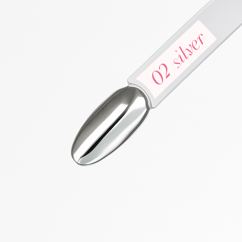 Το 02 Silver Chrome είναι ένα εντυπωσιακό chrome gel polish με καθαρό, ασημί καθρέφτισμα που χαρίζει μοντέρνα και εκλεπτυσμένη λάμψη σε κάθε manicure. Η chrome σύνθεση του αντανακλά το φως δημιουργώντας ένα ultra-metallic αποτέλεσμα.